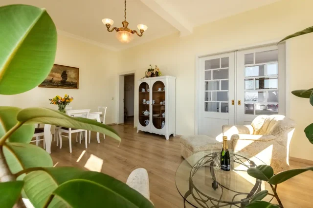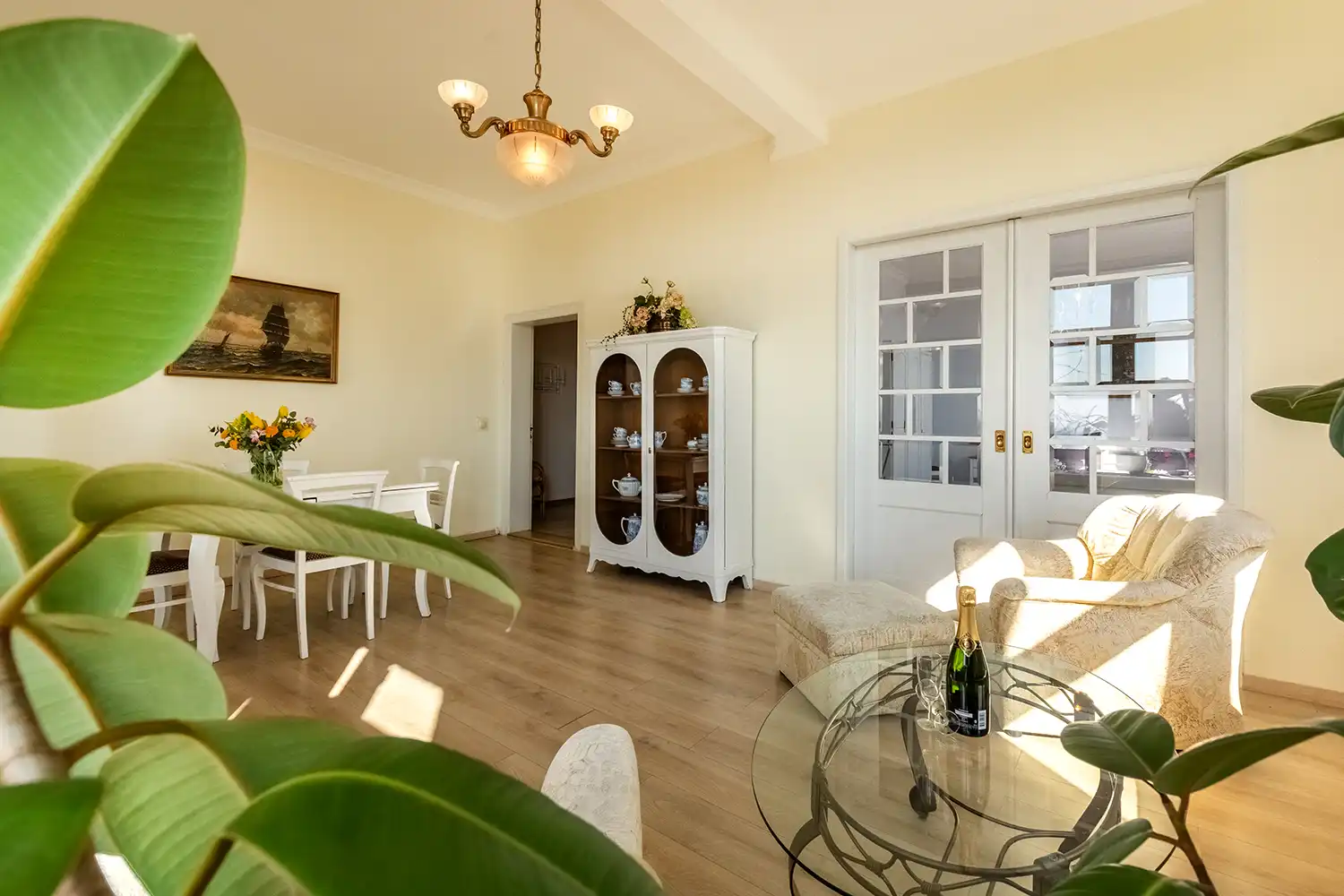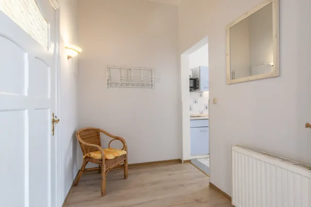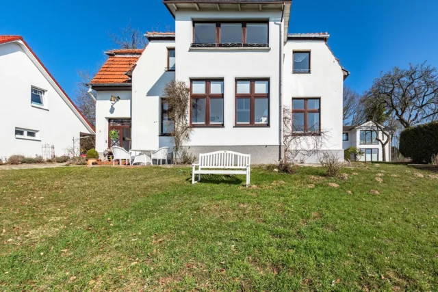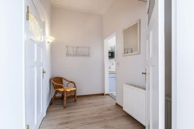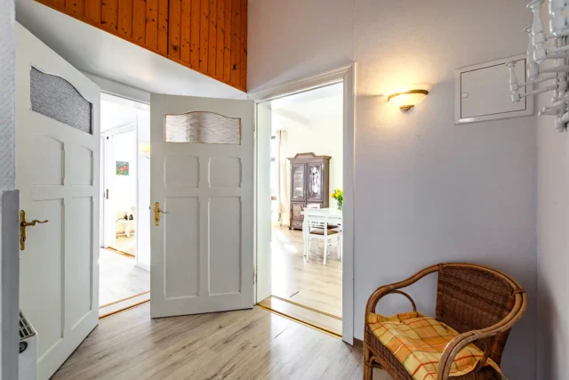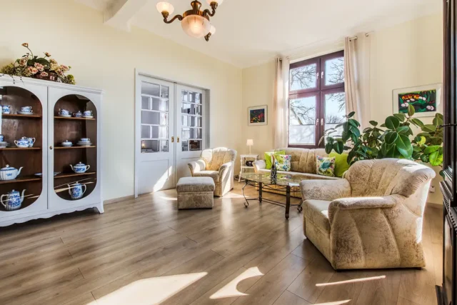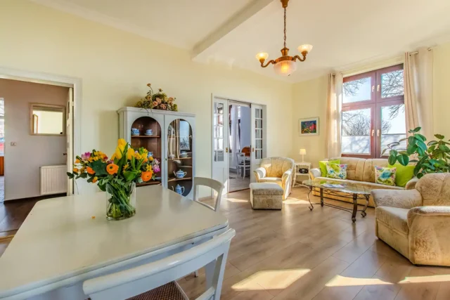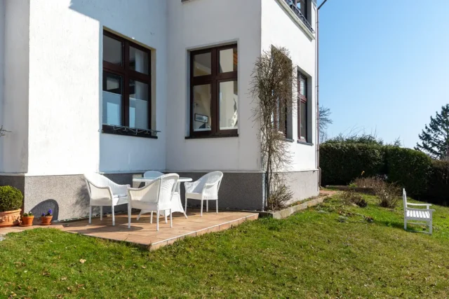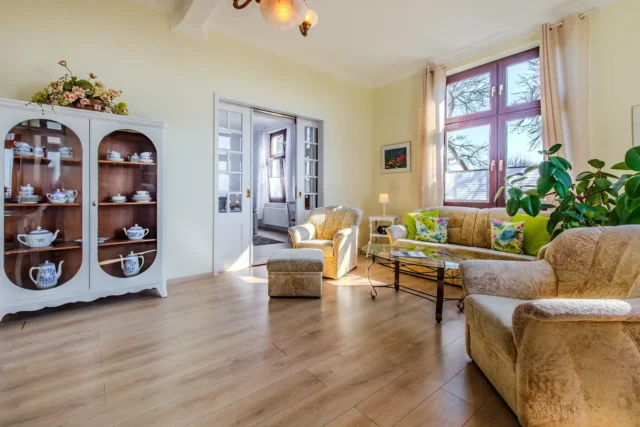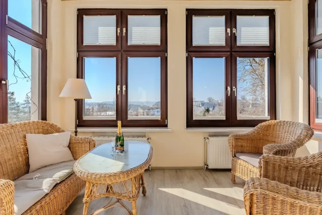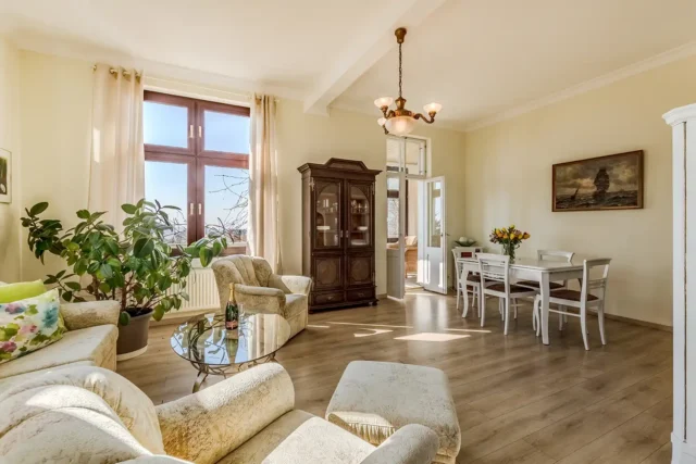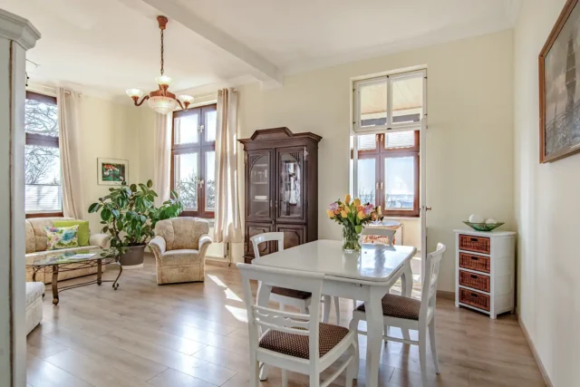 Die Ferienwohnung 1 ist hell und großzügig geschnitten, mit tollem Meeresblick und Terrasse. Eine sehr geräumige und stilvolle Wohnung mit großem Wohnzimmer und gemütlicher Sitzgruppe im Verandazimmer mit Blick auf die Ostsee.