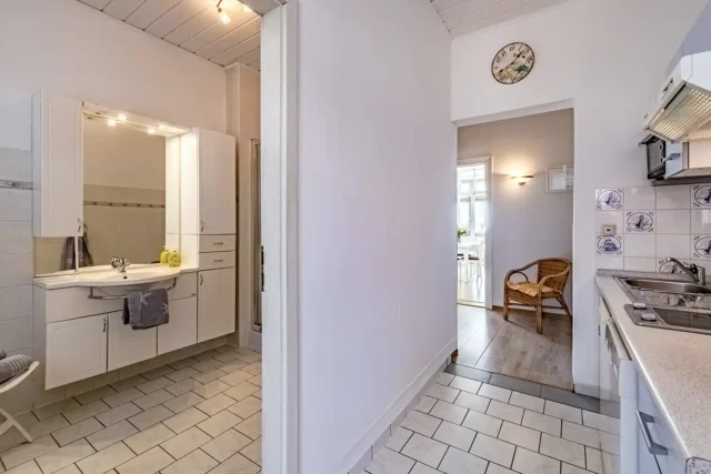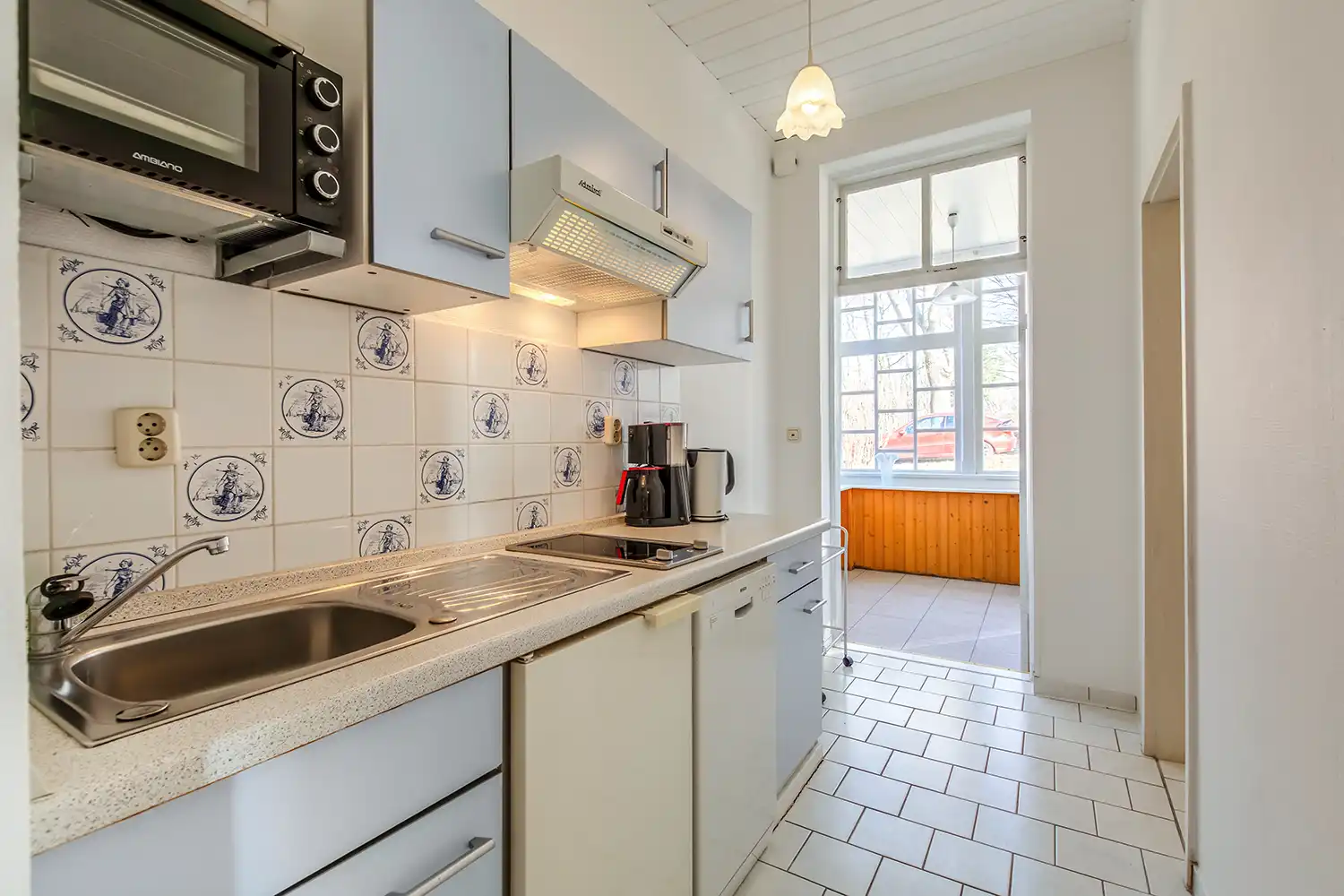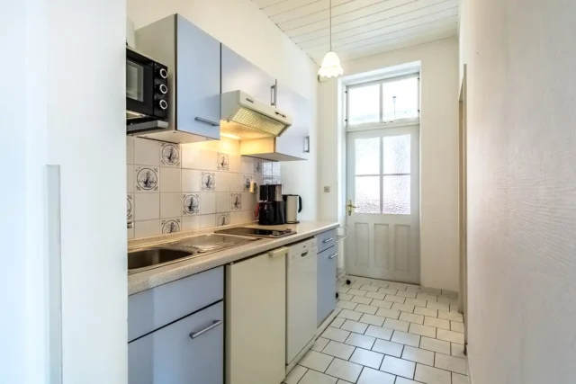 - separate Küche mit 2-Cerankochfeldern, Geschirrpüler, Kühlschrank, Kaffeemaschine, Wasserkocher, Mikrowelle, Geschirr, Gläser, Besteck und Küchenzubehör