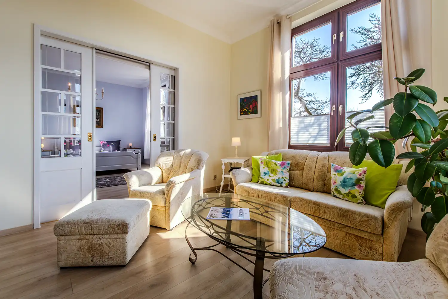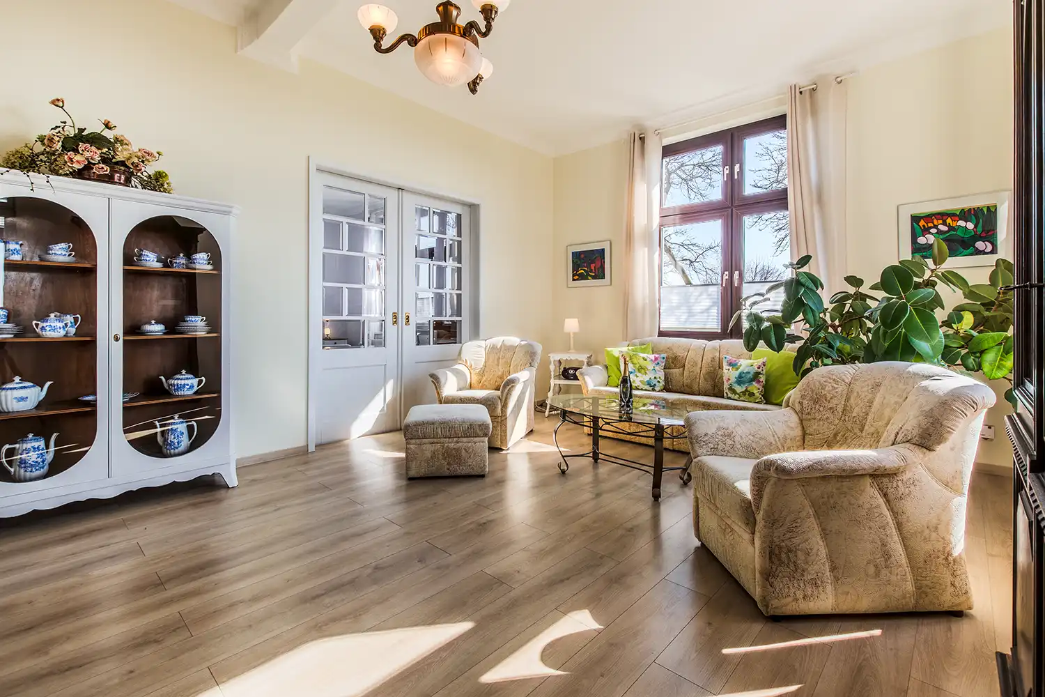 - Geräumiges Wohnzimmer mit Polstergarnitur und Schlafcouch